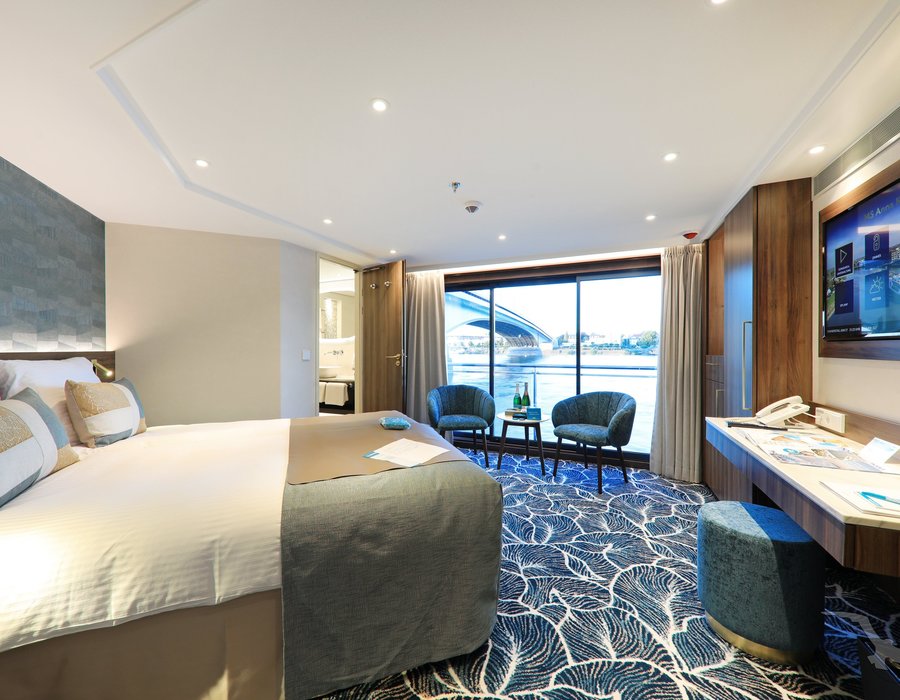Alle Kabinen liegen außen und sind komfortabel und luxuriös eingerichtet und haben einen französischen Balkon. Die Betten lassen sich wahlweise als Doppel- oder Einzelbetten stellen.