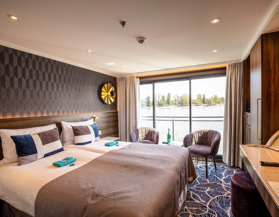 Alle Kabinen liegen außen und sind komfortabel und luxuriös eingerichtet und haben einen französischen Balkon. Die Betten lassen sich wahlweise als Doppel- oder Einzelbetten stellen.