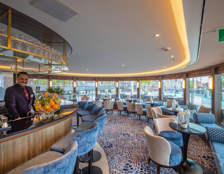Elegante Räumlichkeiten auf 4 Passagierdecks verteilt. Stilvoll eingerichtete Panorama-Lounge mit Bar, Panorama-Restaurant ”Vier Jahreszeiten“ (eine Tischzeit), elegante Heckbar und Heckrestaurant mit Außenterrasse.