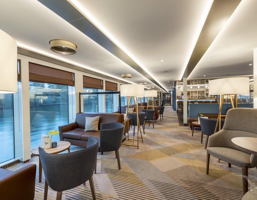 Modernes, stilvolles Ambiente und sportlich-elegante Atmosphäre. Panorama-Restaurant "Vier Jahreszeiten" (eine Tischzeit), elegante Heckbar mit Spezialitäten-Restaurant. Bibliothek, Sauna, Wäscheservice. Großflächiges Sonnendeck mit kleinem Pool, XL-Schachspiel, Liegestühle, Sitzgruppen und Schattenplätze und Sitzterrasse vorne inkl. Barbecue. WLAN (kostenpflichtig), je nach Fahrgebiet kann es ggf. zu Ausfällen/Störungen kommen.