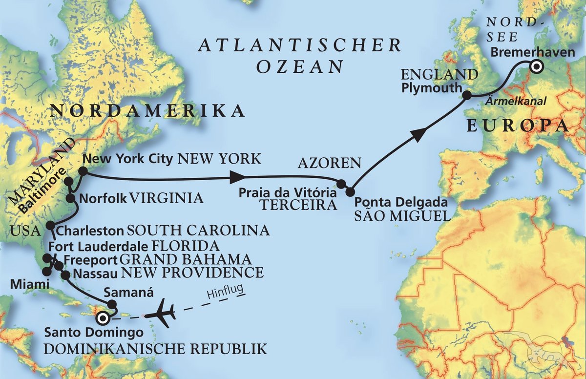 Santo Domingo - Nassau - Fort Lauderdale - Miami - Charleston - Baltimore - New York City - Praia da Vitória - Ponta Delgada - Bremerhaven