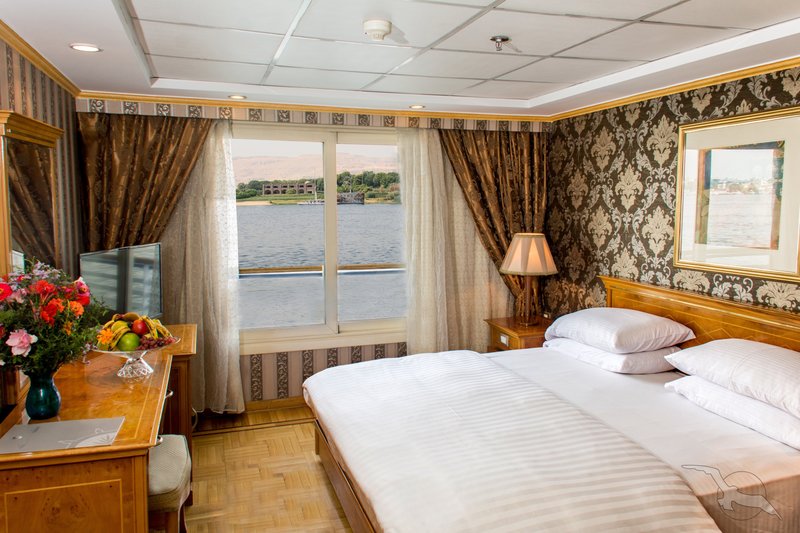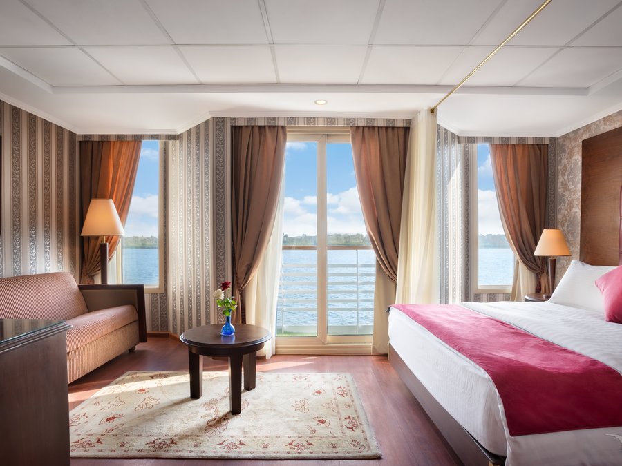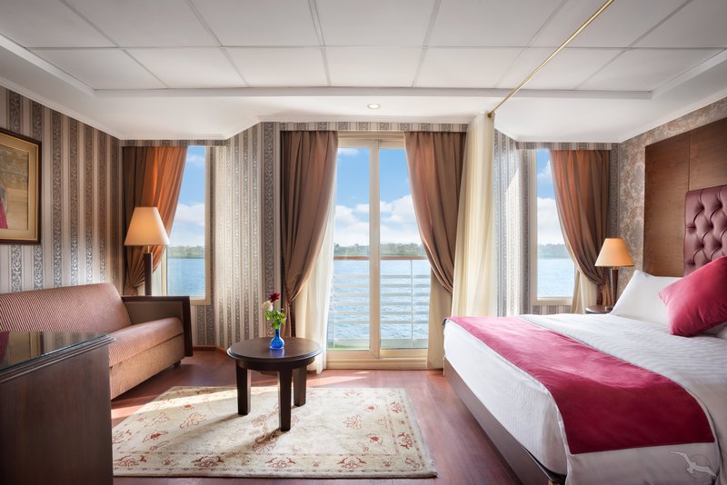 Alle 54 Kabinen des Schiffs liegen außen, auf dem Sobekdeck mit zu öffnenden Panoramafenstern, auf dem Osirisdeck mit französischem Balkon (jeweils ca. 20 m²) sowie Superiorkabinen auf dem oberen Atondeck mit kleinem Balkon und Sitzgelegenheiten (ca. 26 m²). Komfortabel und geschmackvoll ausgestattet mit Bad/WC, Föhn, regulierbare Klimaanlage, SAT-TV, Musik-, Film- und Dokumentationskanal, Schiffstelefon, Privatsafe, Kabinenservice, Kühlschrank. 220 Volt Wechselstrom.
