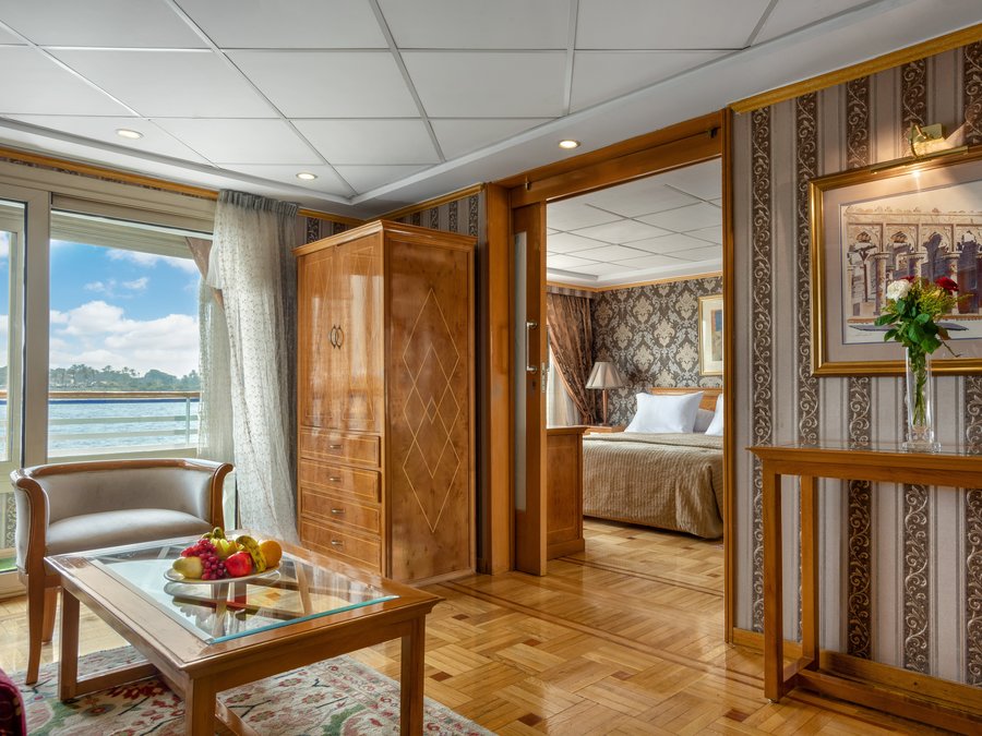Die beiden Suiten liegen im Bugbereich sind komfortabel und geschmackvoll eingerichtet, sehr geräumig und verfügen über einen französischen Balkon. Ausstattung: Separater Wohnbereich mit Sitzgelegenheiten, Bad/WC und Jacuzzi, Föhn, regulierbare Klimaanlage, SAT-TV, Musik-, Film- und Dokumentationskanal, Schiffstelefon, Privatsafe, Kabinenservice, Kühlschrank. 220 Volt Wechselstrom. Kabinengröße ca. 40 m².