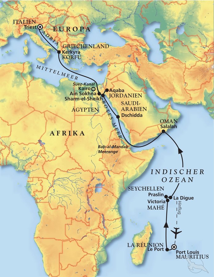 Port Louis - Victoria - Salalah - Dschidda - Sharm-el-Sheikh - Aqaba - Suez-Kanal - Triest
