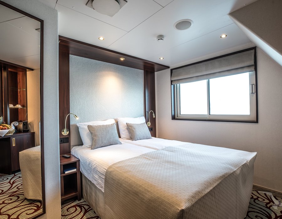 Alle Kabinen liegen außen, sind komfortabel und elegant eingerichtet mit französischem Balkon, raumhoher Fensterfront und Schiebetür. Die Betten lassen sich wahlweise als Doppel- oder Einzelbetten stellen.